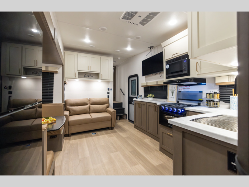 Sleeps 4 Slides 3 Length 35 ft Ext Width 8 ft Ext Height 13 ft 4 in Hitch Weight 2180 lbs Dry Weight 10864 lbs Cargo Capacity 3316 lbs Fresh Water Capacity 64 gals Grey Water Capacity 88 gals Black Water Capacity 44 gals Furnace BTU 35000 btu Available Beds King Refrigerator Type 12V Refrigerator Size 16 cu ft Cooktop Burners 4 Number of Awnings 2 LP Tank Capacity 30 lbs Water Heater Type On Demand Tankless AC BTU 27000 btu TV Info LR 50" TV Awning Info 10' 6" and 16' Power w/LED Lights Axle Count 2 Washer/Dryer Available Yes Number of LP Tanks 2 Shower Type Standard Electrical Service 50 amp Solar Wattage 200 watts Similar Floorplans